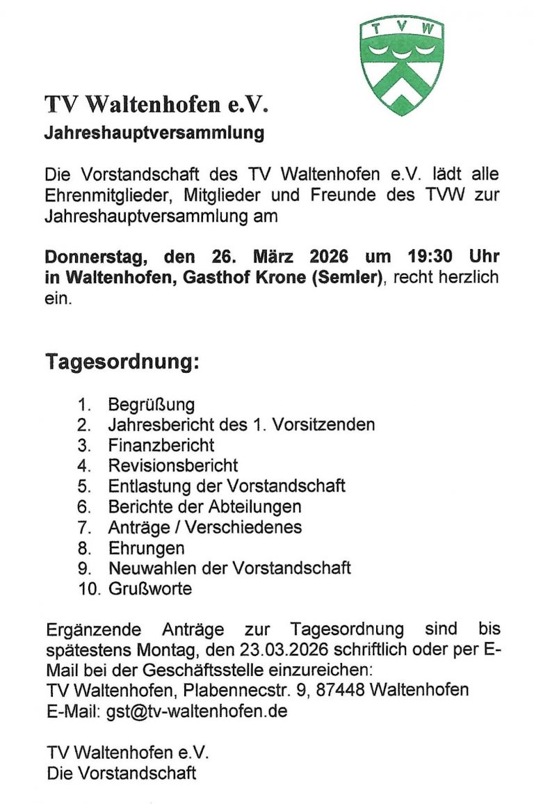 Am Freitag, den 27.03.2026 findet die diesjährige Jahreshauptversammlung der Judo-Abteilung des TV Waltenhofen statt.