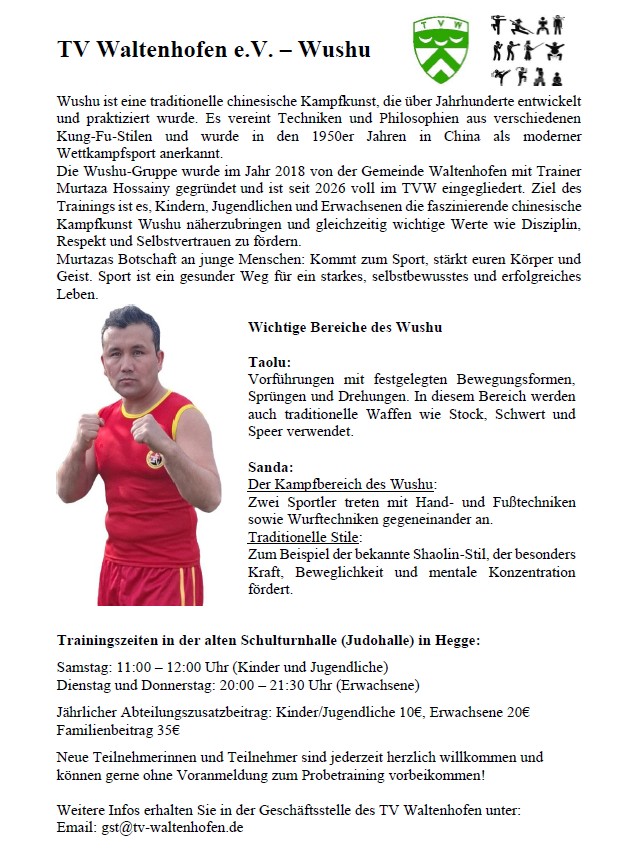 Wushu Training Beitrags-Autor:SU_Judoka Beitrag veröffentlicht:11. April 2026 Beitrags-Kategorie:Allgemein Wushu ist eine traditionelle chinesische Kampfkunst, die über Jahrhunderte entwickelt und praktiziert wurde… Schlagwörter: chinesisch, Kampfkunst, Wushu Please Share This Diesen Inhalt teilen Öffnet in einem neuen Fenster X Öffnet in einem neuen Fenster Facebook Öffnet in einem neuen Fenster Pinterest Das könnte dir auch gefallen Abenteuer im Kletterwald Grüntensee 7. Juli 2025 Judo Waltenhofen im TV 23. Mai 2025 Grandioser Ippon Girls Lehrgang 2025 25. Mai 2025